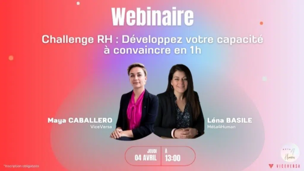 Développez votre aptitude à persuader en seulement une heure avec ce webinaire essentiel destiné aux professionnels des ressources humaines ! Dans un monde professionnel où la persuasion fait toute la différence, cet événement en ligne vous fournira les clés pour transformer vos interactions quotidiennes. Que vous cherchiez à influencer votre direction générale, à rallier les managers, à renforcer votre marque employeur auprès des candidats ou à accroître l'engagement de vos collaborateurs, ce webinaire est spécialement conçu pour répondre à vos besoins. Animé par deux expertes certifiées en intelligence émotionnelle, Léna BASILE, forte de plus de 15 ans d'expérience en RH et en coaching, et Maya CABALLERO, experte en développement commercial depuis plus de 15 ans, cet événement vous propose un programme complet : découvrez l'importance cruciale de maîtriser l'art de la persuasion dans votre quotidien RH, surmontez les croyances limitantes qui entravent votre capacité à persuader grâce à des insights en intelligence émotionnelle et des techniques éprouvées, et apprenez à convaincre efficacement avec des méthodes simples et efficaces. En bonus, repartez avec trois astuces concrètes pour convaincre efficacement en toutes circonstances, que ce soit en interne ou en externe. Ne manquez pas cette opportunité unique de poser vos questions et de recevoir des conseils personnalisés de Maya Caballero, fondatrice de ViceVersa, et de Léna Basile, fondatrice de Méta4Human. Transformez votre approche RH et développez votre capacité de persuasion. Inscrivez-vous dès maintenant pour révolutionner votre façon de convaincre et d'engager. Les places sont limitées !