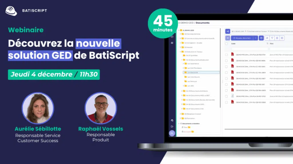 Ce webinaire présente une nouvelle solution de gestion électronique des documents (GED) adaptée aux besoins des professionnels du secteur de la construction et du bâtiment. Il met en lumière les innovations apportées par cette version, ainsi que les avantages qu’elles offrent pour organiser, stocker et accéder aux documents de manière plus efficace. La session propose une démonstration en direct pour illustrer concrètement les fonctionnalités et montrer comment elles peuvent répondre aux besoins opérationnels du terrain. Un temps d’échanges est également prévu pour approfondir certains points et répondre aux interrogations spécifiques des participants.