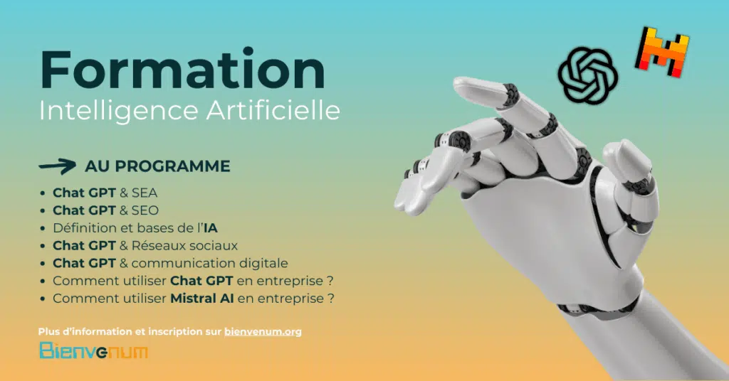 L’intelligence artificielle transforme progressivement les méthodes de travail dans de nombreux secteurs. Ce webinaire propose une introduction complète aux principaux usages de l’IA en entreprise. Il explore les bases théoriques de cette technologie tout en présentant des applications concrètes dans le domaine du marketing digital et de la communication. L’accent est mis sur l’utilisation de ChatGPT dans différents contextes professionnels ainsi que sur les nouvelles possibilités offertes par des outils comme Mistral AI. En dix heures, les participants pourront comprendre les enjeux, découvrir les cas d’usage et mieux appréhender l’intégration de ces solutions au quotidien.